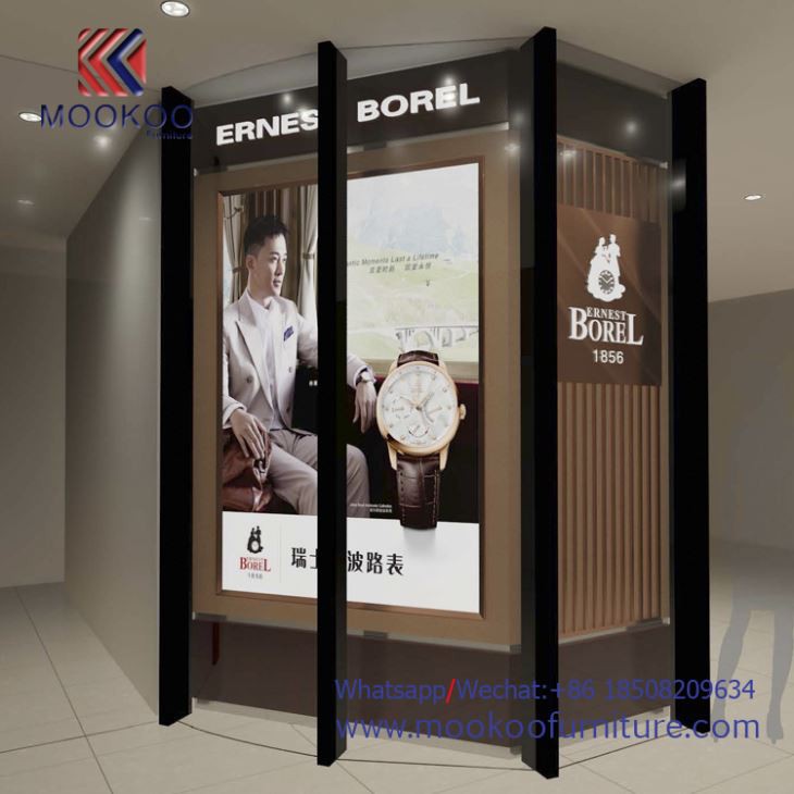 Ko'rish do'koni bezatish temperli shisha va yaxshi sifatli MDF soatlar ekran vitrini